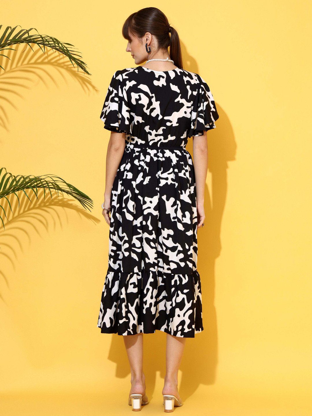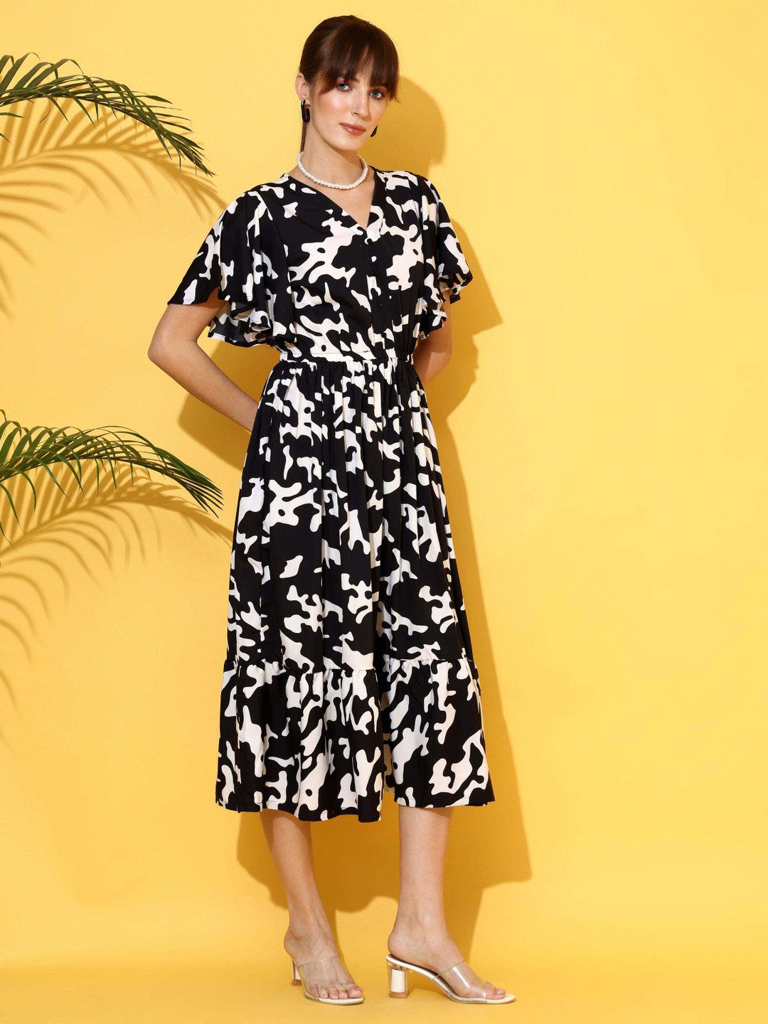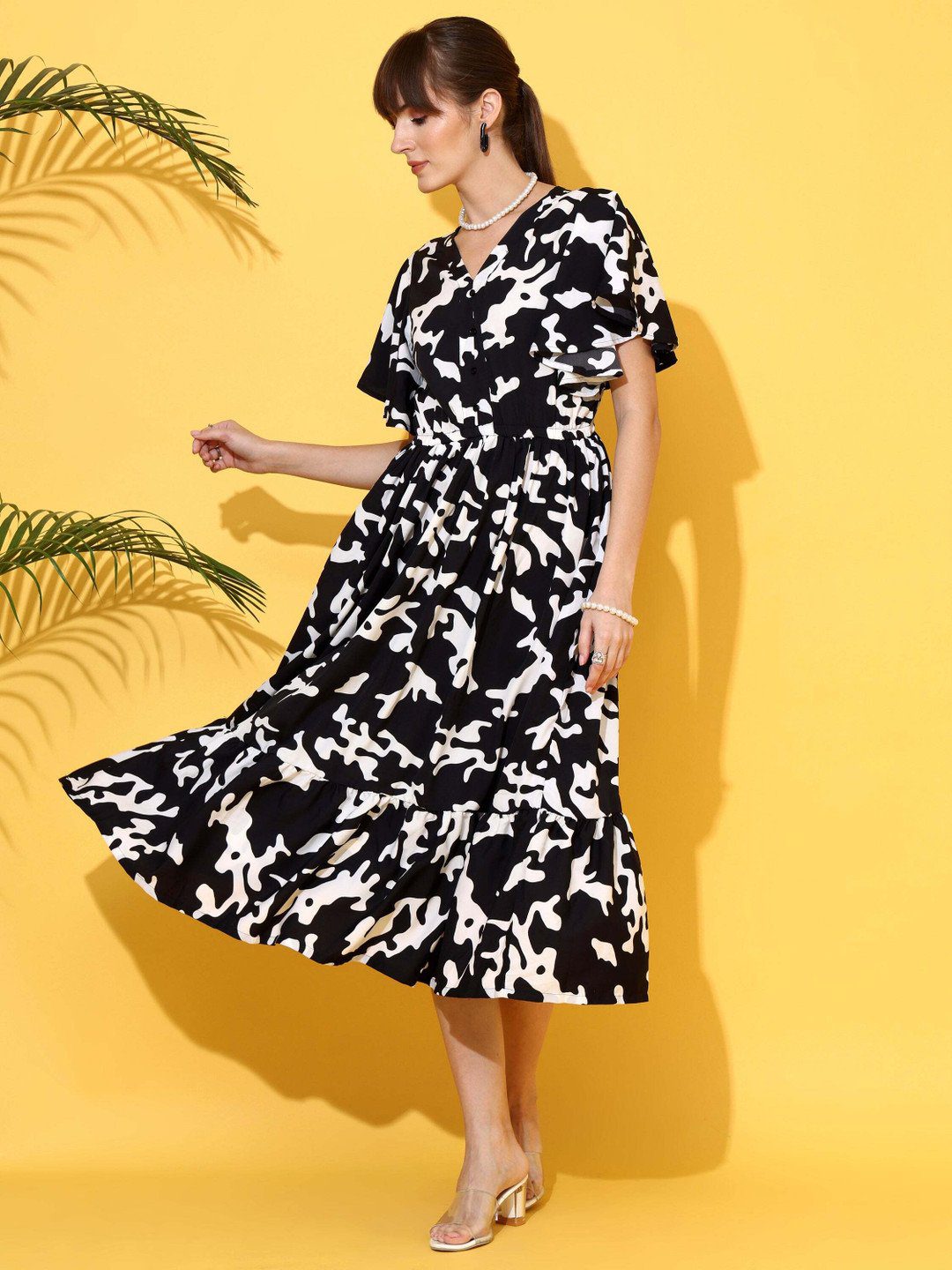 Black abstract print fit & flare dress • V-neck •Short,flared sleeves • Midi length in flared hem •
