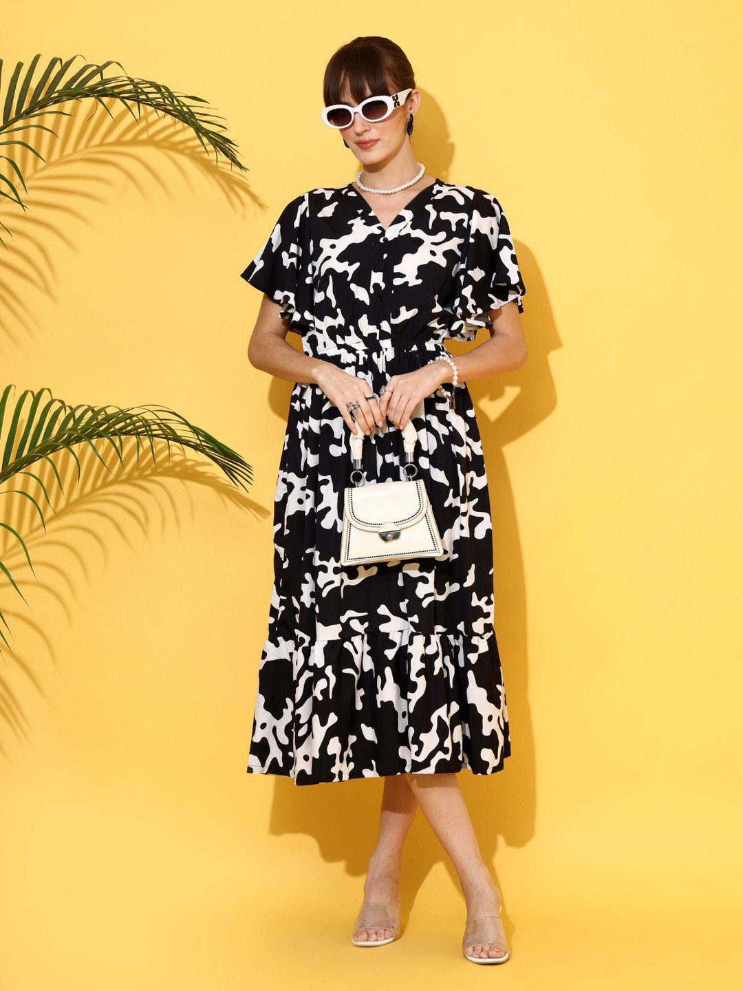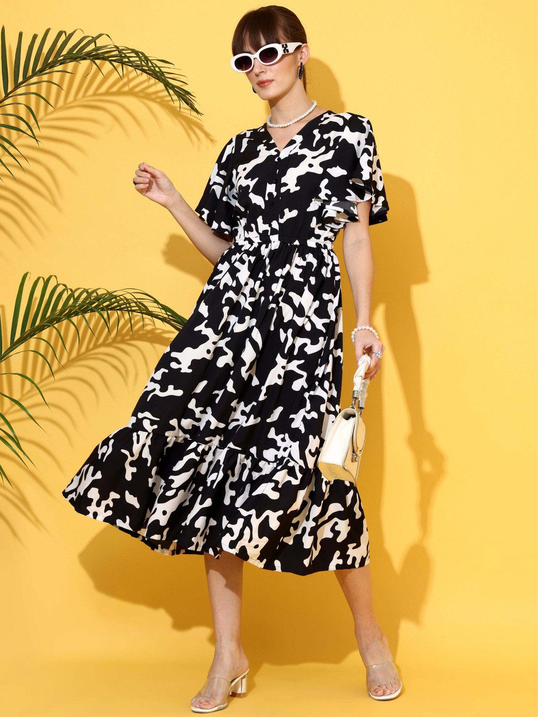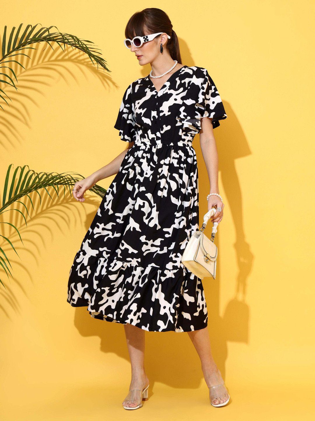 Black abstract print fit & flare dress • V-neck •Short,flared sleeves • Midi length in flared hem •
