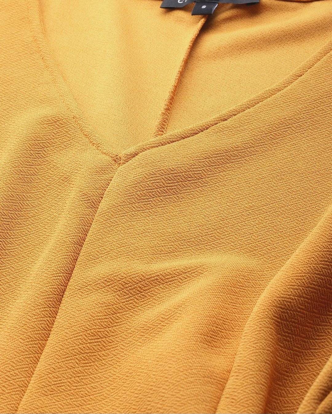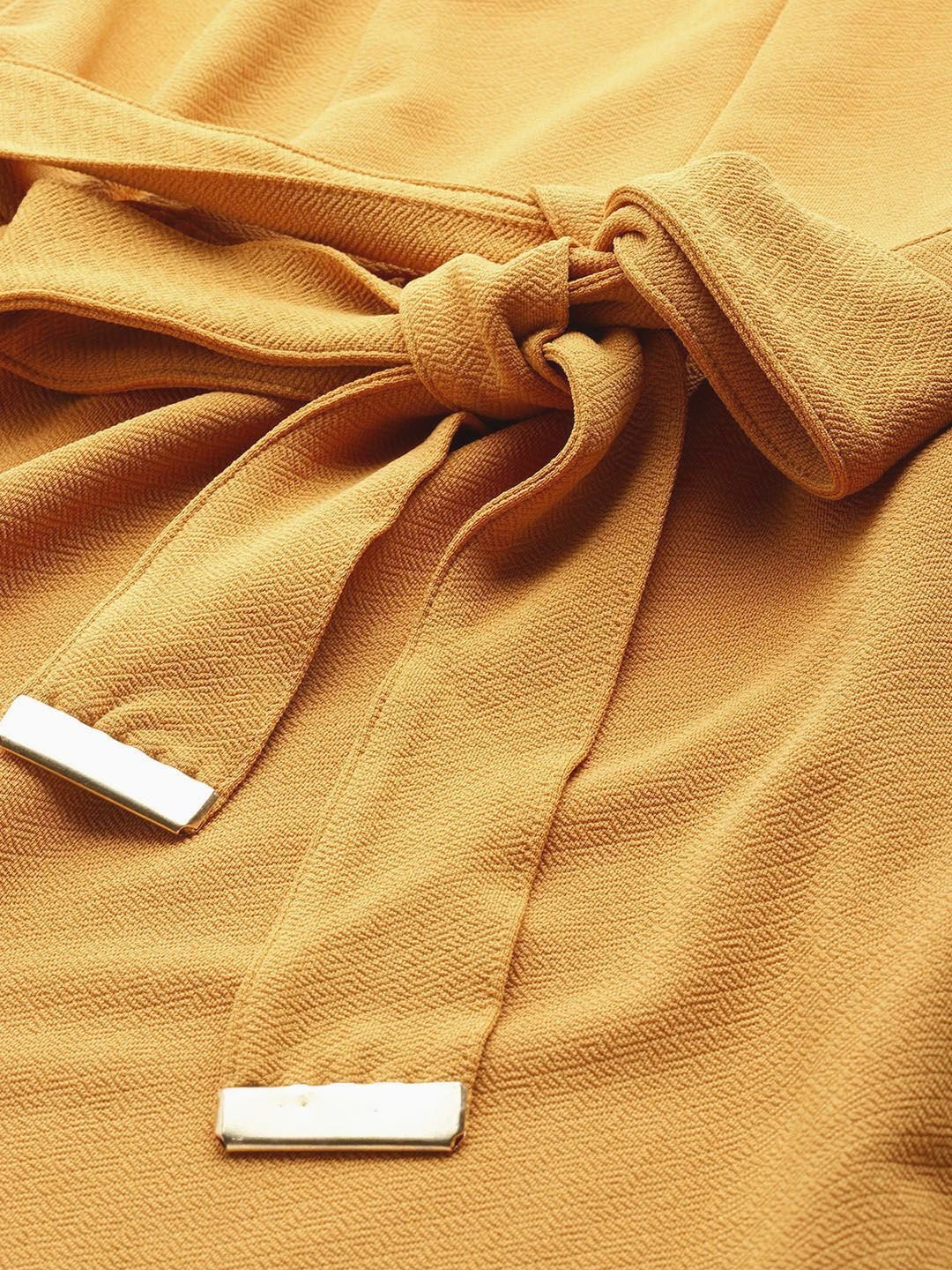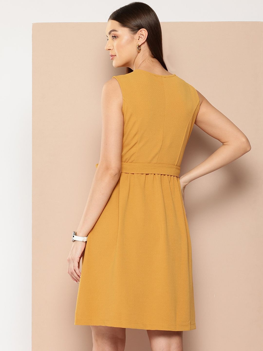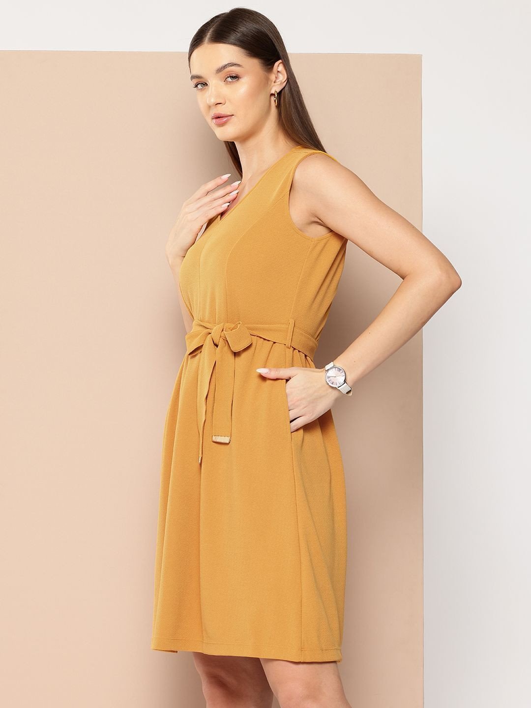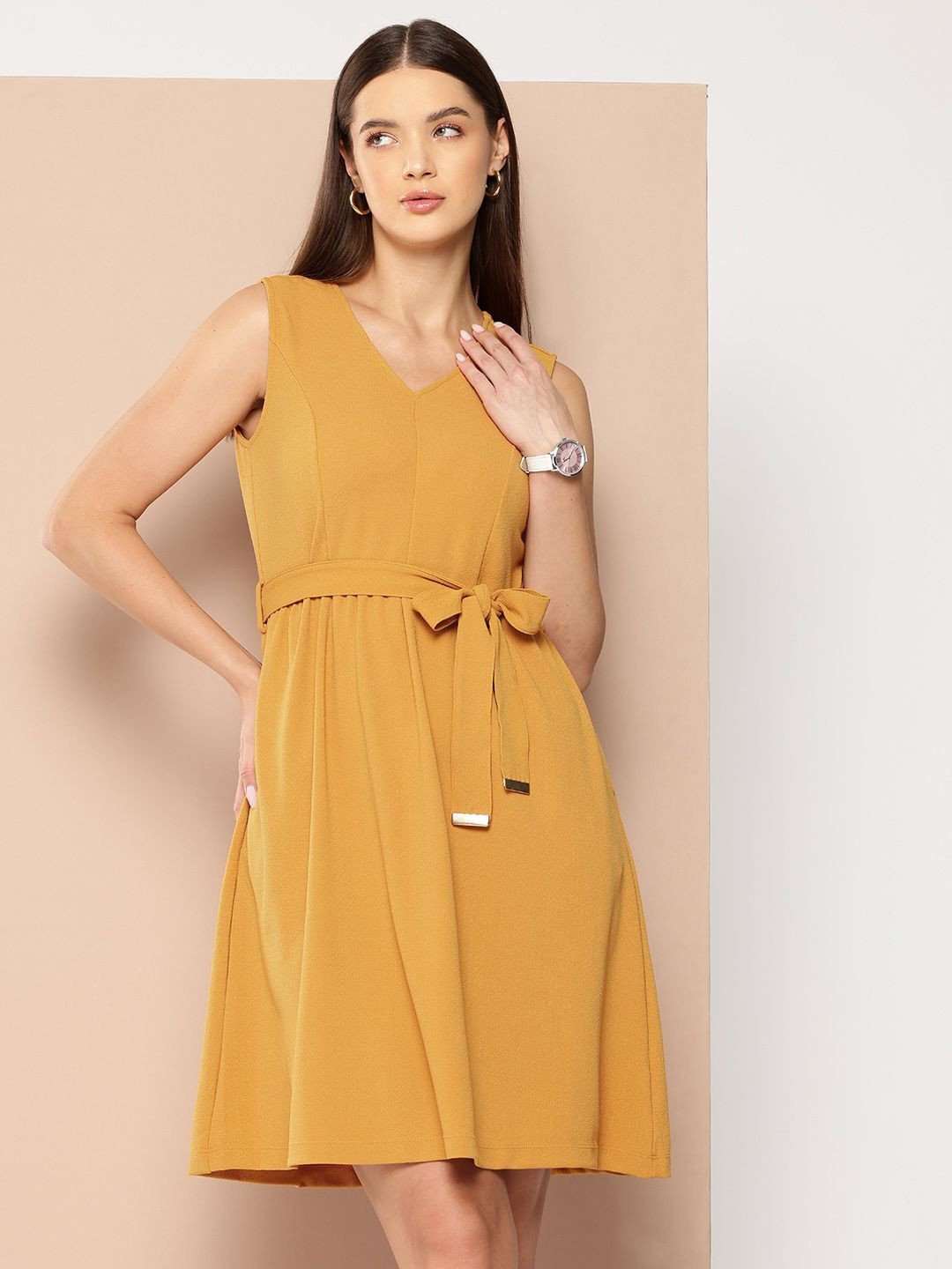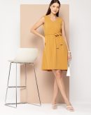 Mustard yellow solid a-line dress • V-neck • Sleeveless, no sleeves • Knee length in flared hem • Comes with a belt